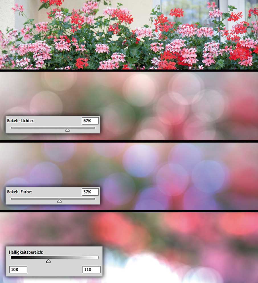 Die Größe der Zerstreuungskreise hängt ab vom gewählten »Weichzeichnen«-Radius. Ihre Helligkeit stellen Sie mit dem Regler »Bokeh-Lichter« ein, »Bokeh-Farbe« ermöglicht das Einfärben der Spitzlichter anhand der an der jeweiligen Bildstelle vorliegenden Farbinformationen.