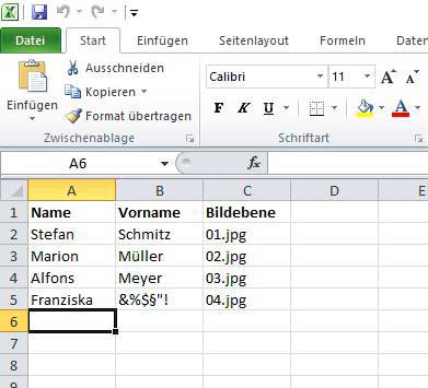 Sonderzeichen sind auch kein Problem, wie man an dem vierten Datensatz erkennen kann. In Excel (2010 und höher) habe ich festgestellt, dass, wenn man die Tabelle gefüllt hat und dann wie im Bild beschrieben, die erste Zelle der nächsten Zeile markiert war, keine Fehler auftraten.