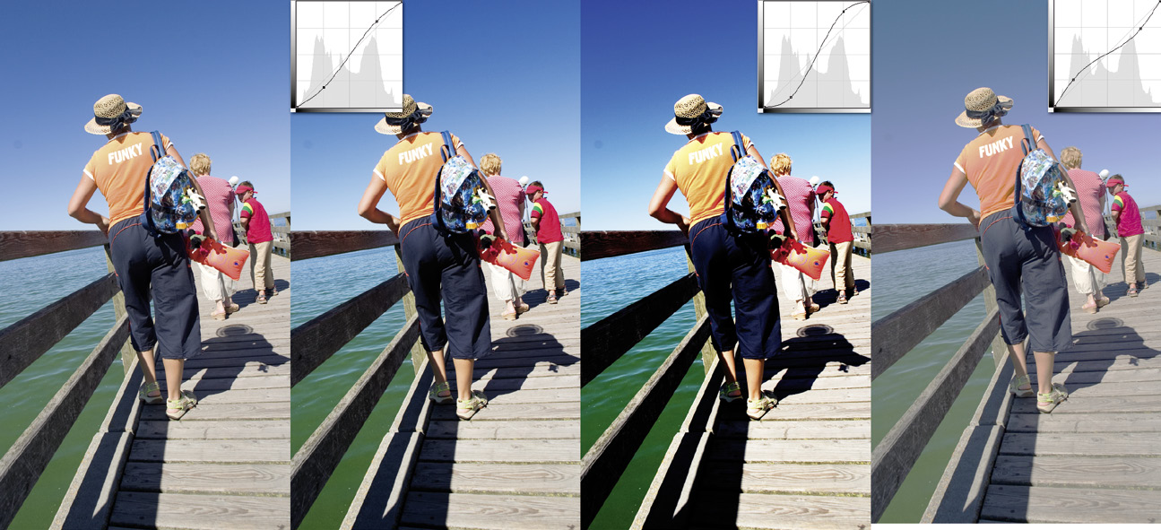 Im Alltag geht es meist nicht darum, nur die Tiefen, die Lichter oder die Mitteltöne zu verändern, sondern möglichst alle drei Tonwertbereiche aufeinander abgestimmt zu korrigieren. Von daher verzichtet man auf Einzeleinstellungen und versucht mit den Mitteln der Gradationskurve, mehrere Parameter zu verändern. Am beliebtesten ist dafu?r die sogenannte S-Kurve, die ihren Namen von ihrer Form ableitet. Je klarer das S erkennbar ist, desto mehr werden die Kontraste verstärkt. Klicken Sie zum Anlegen einer S-Kurve zunächst in die Mitte der Geraden, danach setzen Sie zwei weitere Anfasser etwa mittig zwischen dem Mittel- und die beiden Endpunkte. Den Punkt in den Lichtern ziehen Sie weiter nach oben, den in den Tiefen nach unten. Das Foto hat nun deutlich härtere Kontraste, ohne dass dabei Zeichnung verloren gegangen wäre. Wollen Sie dagegen die Schatten aufhellen und die Lichterkontraste etwas verringern, dann verschieben Sie die beiden Anfasser auf die andere Seite der Achse. In unserem Beispielbild sieht man sehr gut, wozu sich diese Kurven eignen. Die S-Kurve bringt Leben in kontrastschwache Fotos, ihr gespiegeltes Pendant hilft dagegen beim Ausgleich von zu starken Kontrastverhältnissen.