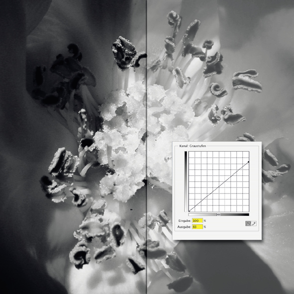 Sie können einen Korrekturpunkt in der Gradationskurve statt mit Klicken und Ziehen auch tonwertgenau über die Eingabe von Ziffern setzen. Wenn Sie den Punkt aktiviert haben, sehen Sie unten im Dialog zwei Werte: Oben die „Eingabe“, also den Tonwert des Ausgangsbilds, unten die „Ausgabe“, den Wert dieses Tons nach der Korrektur. Durch Zifferneingaben oder durch Verändern der Werte mittels der Pfeiltasten steuern Sie die genaue Verschiebung über die Tastatur. Das ist zum Beispiel besonders dann sinnvoll, wenn Sie etwa ein Schwarzweißbild für den Druck abstimmen und wegen einer schlechten Papierqualität statt maximal 100 Prozent Farbauftrag nur 83 Prozent verwenden dürfen, damit die Details in den Tiefen sichtbar bleiben. Graustufen- und CMYK-Bilder erlauben Eingaben zwischen 0 und 100 Prozent, RGB-Bilder zwischen 0 und 255.