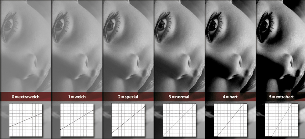 Um eine Vorstellung von dem zu erhalten, was sich hinter dem Begriff „Gradation“ verbirgt, betrachten wir zunächst die Auswirkungen auf ein Graustufenbild. Wer Erfahrungen in der analogen Schwarzweiß-Dunkelkammer sammeln durfte, kennt den Begriff Gradation als Merkmal von Fotopapier. Das wurde früher (vor der Erfindung des Multi-Grade-Papiers, das alle Kontrastvariationen wiedergeben kann) in sechs verschiedenen Gradationen zwischen extraweich und extrahart angeboten. Der Unterschied zwischen den Abstufungen liegt in der Art und Weise, wie fein Tonwert- Nuancen in den Bildkontrasten erhalten bleiben.