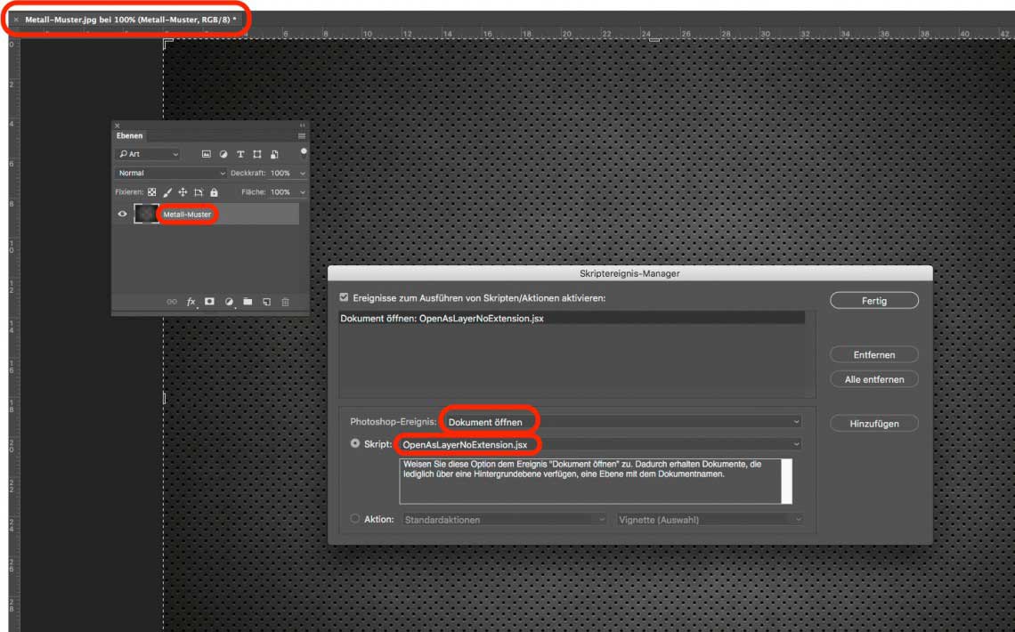 Nun müssen Sie Photoshop nur noch anweisen, das Skript beim Öffnen eines Dokumentes anzuwenden. Dafür kommt der »Skriptereignis-Manager« zum Einsatz, den Sie im Menü »Datei > Scripten« finden. Wählen Sie unter »Photoshop-Ereignis > Dokument öffnen« aus und unter »Skript« die Datei »OpenAsLayerNoExtension.jsx«. Klicken Sie auf »Hinzufügen« und bestätigen Sie mit »Fertig«. Fortan öffnet Photoshop Bilder nicht mehr als gesperrte Hintergrundebene, sondern als sofort editierbare Ebene, deren Benennung dem Dateinamen entspricht. Es lohnt sich, auch einmal andere Skripte auszuprobieren.