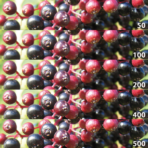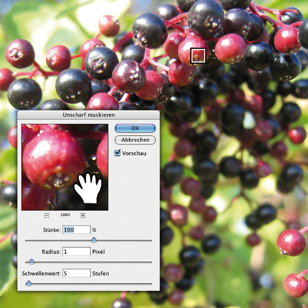 Betrachten wir zunächst, welche Veränderungen der Regler „Stärke“ nach sich zieht; der Zahlenwert in dem ihm zugeordneten Feld ändert sich beim Verschieben automatisch, kann aber auch direkt per Tastatur eingegeben werden. Während die Werte für „Radius“ unverändert bei 100 und für „Schwellenwert“ bei 5 blieben, wurde – von oben nach unten – der Prozentwert für „Stärke“ auf 50, 100, 200, 400 und 500 (der Maximalwert) gesetzt. Scharf abgebildete Holunderbeeren werden überschärft, leicht flaue wirken scharf, unscharfe erhalten etwas härtere Konturen.