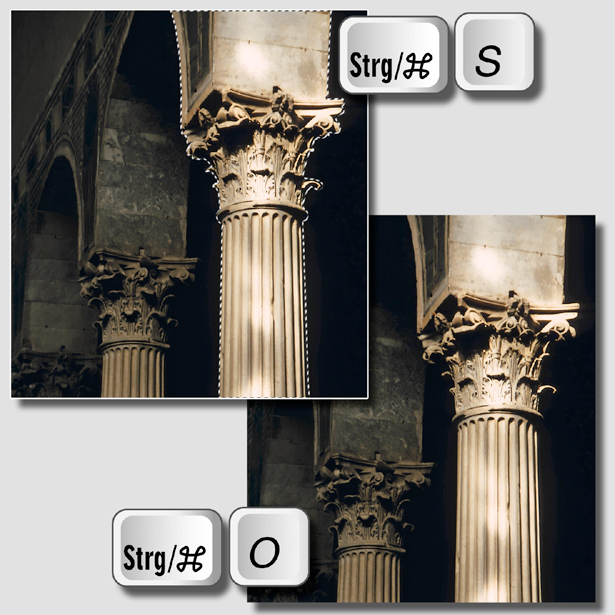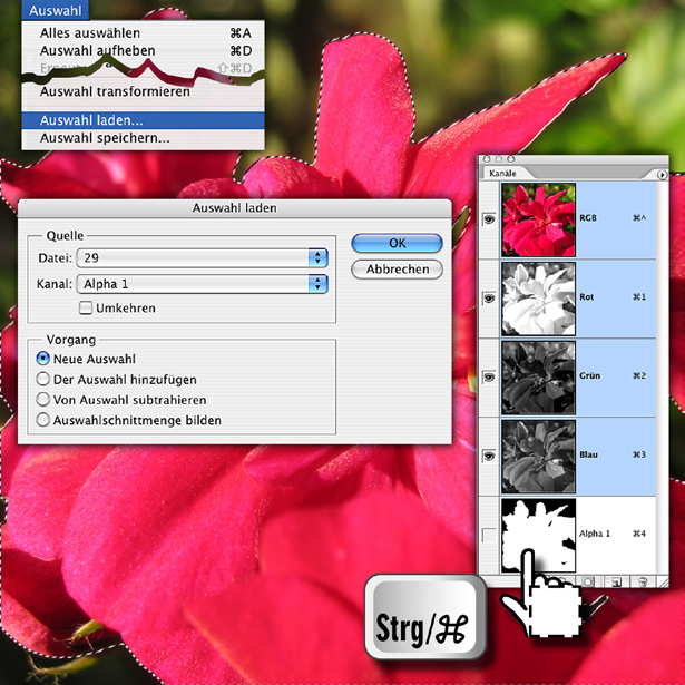 Nun wären Alphakanäle ziemlich unnu?tz, wenn man Auswahlen zwar in ihnen speichern, sie aber nicht wieder aus ihnen herausholen könnte – das entspräche einem Sparschwein, das eingeworfene Mu?nzen unwiederbringlich verschluckt. Der Zweck eines Alphakanals besteht darin, eine Auswahl so lange aufzubewahren, bis Sie sie erneut benötigen. Sie können einen Alphakanal daher jederzeit in eine Auswahl zuru?ckverwandeln; der Kanal bleibt dabei unverändert bestehen, und die Auswahl entsteht erneut. Dieser Vorgang wird in Photoshop als „Laden“ der Auswahl bezeichnet. Dazu gehen Sie u?ber „Auswahl > Auswahl laden > Alpha > Neue Auswahl“; wesentlich schneller gelangen sie zum selben Ergebnis, wenn Sie die Thumbnail-Darstellung des Kanals in der Ebenen-Palette mit gedru?ckter Strg-/Befehlstaste anklicken.