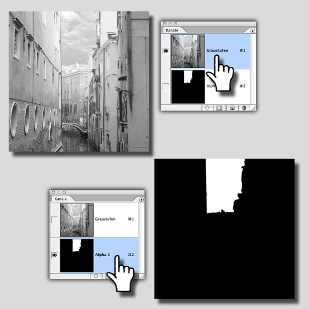 In der Kanäle-Palette wird immer die Zeile desjenigen Kanals mit einer farbigen Unterlegung hervorgehoben, den Sie aktiviert haben. Veränderungen vornehmen können Sie nur in aktivierten Kanälen. Sobald der Kompositkanal, also der oberste in der Palette, aktiviert ist, sind auch alle Farbkanäle aktiv, aus denen er sich zusammensetzt. Um einen Kanal zu aktivieren, klicken Sie mit dem Cursor in seine Kanalzeile. Klicken Sie auf die des Kompositkanals oder bei diesem Graustufenbild auf die Zeile des Bildes, wird Ihnen dieses am Monitor angezeigt und kann bearbeitet werden (oben). Klicken Sie auf die Kanalzeile des Alphakanals, erscheint dieser und steht fu?r Eingriffe bereit. Das Auge ganz links in der Zeile des jeweiligen Kanals zeigt an, dass dieser sichtbar beziehungsweise unsichtbar ist.