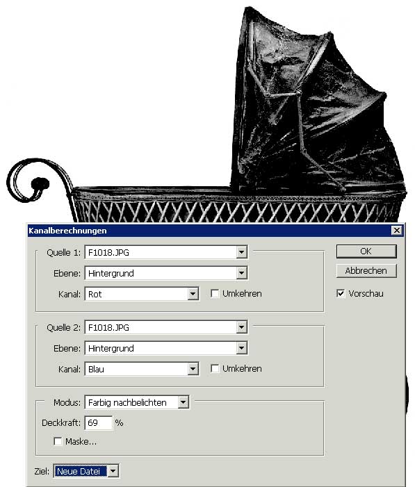Mit dem Kanalberechnungen aus dem Bild-Menü können sie Farb- und Helligkeitsinformationen aus zwei Quellen nach unterschiedlichen Methoden miteinander verrechnen.