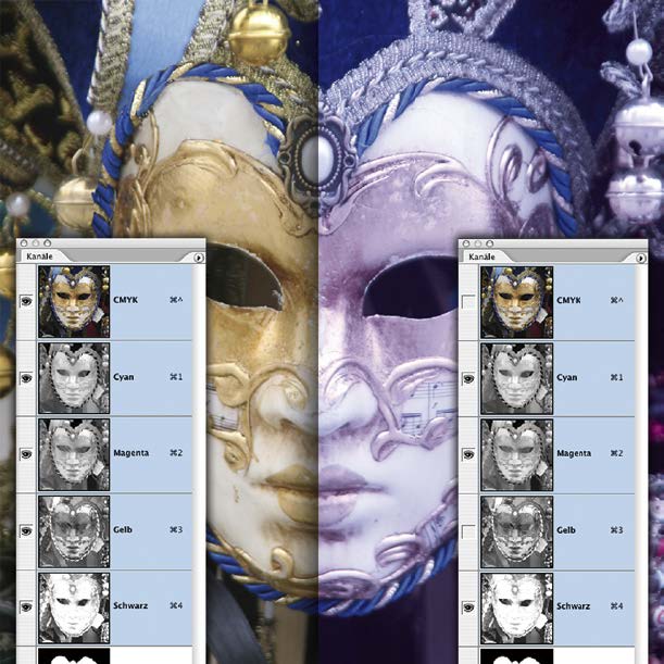 Der Kompositkanal ist in der Namensspalte der Kanälepalette immer gekennzeichnet mit der Abku?rzung des jeweils verwendeten Farbmodus, hier also „CMYK“ fu?r die vier Druck-Grundfarben: C= Cyan, M=Magenta, Y=Gelb und K=Schwarz. Er entspricht der sichtbaren Wiedergabe aller vorhandenen Farbkanäle. Bei Graustufenbildern sind Komposit- und Farbkanal identisch, bei RGB- und Lab-Bildern gibt es drei, bei CMYK-Bildern vier Farbkanäle. Blenden Sie einen oder mehrere Farbkanäle durch Wegklicken des Augensymbols aus – in der rechten Bildhälfte ist das der Gelb-Kanal des CMYK-Bildes – fehlt dieser Farbanteil in der Kompositansicht (rechts).