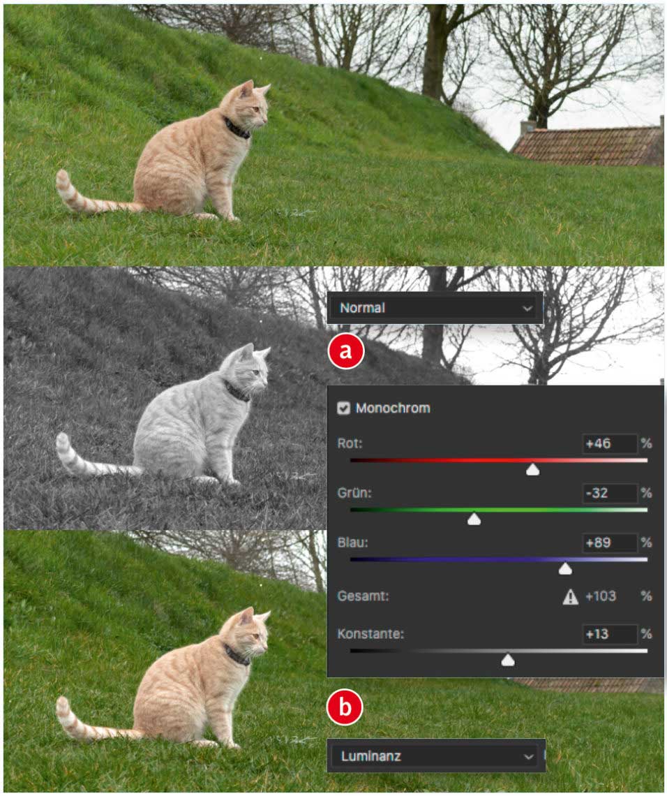 Der »Kanalmixer« lässt sich unter anderem verwenden, um den Bildkontrast kreativ zu ändern. Dazu erzeugen Sie mit einer Einstellungsebene vom Typ »Kanalmixer« mit aktivierter Option »Monochrom« zunächst eine kontrastreiche Schwarzweiß-Umsetzung aus den drei Kanälen (a). Um die Farben der Hintergrundebene zurückzubringen, ändern Sie die Füllmethode der Einstellungsebene in »Luminanz« (b) und senken bei Bedarf ihre »Deckkraft«.