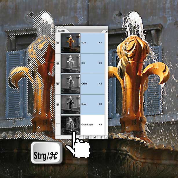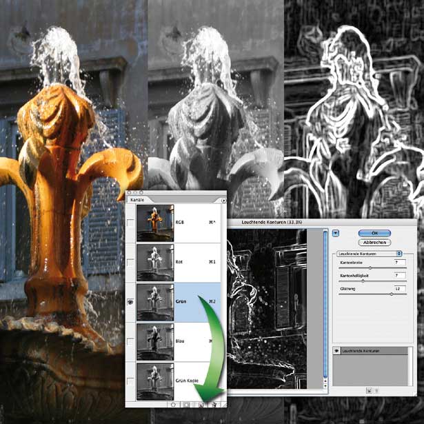 Ein Hauptproblem beim Schärfen ist die Ausbreitung des Effekts auf Bildbereiche, die man vor diesem Einfluss gern schützen würde. Wenn die Filter sich nicht darauf beschränken, Konturen hervorzuheben und Flächen unberücksichtigt zu lassen, müssen Sie sie dazu zwingen. Dazu brauchen Sie eine Auswahl, die nur Konturen freigibt und den Rest des Fotos maskiert, also schützt. Suchen Sie zunächst den kontrastreichsten Farbkanal – hier Grün – und duplizieren Sie ihn als neuen Alphakanal (ein zusätzlicher Kanal, um dauerhaft Graustufeninformationen zu speichern). Wenden Sie auf den neuen Kanal einen Filter an, der Kontrastkonturen erkennt und hervorhebt. Ich habe den Stilisierungsfilter „Leuchtende Konturen“ eingesetzt (rechts); versuchen Sie es auch mit „Konturen finden“ (Filterergebnis anschließend invertieren).