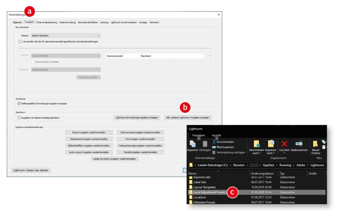 In Lightroom Classic können Sie den Funktionsumfang des »Korrekturpinsels« durch weitere Vorgaben ergänzen. Zahlreiche Webseiten bieten umfangreiche Zusammenstellungen an Pinselvorgaben, die der Nutzer nur noch installieren muss. Das Prozedere hat sich über die unterschiedlichen Programmversionen allerdings etwas geändert. Öffnen Sie Lightroom Classic und wählen Sie im Menü »Bearbeiten > Voreinstellungen…«. Klicken Sie auf den Reiter »Vorgaben« (a) und anschließend auf die Schaltfläche »Alle weiteren Lightroom-Vorgaben anzeigen« (b). Unter Windows 10 öffnet sich der Explorer und zeigt das Unterverzeichnis an, in dem Lightroom Classic lokale Inhalte ablegt (c). Navigieren Sie in das Verzeichnis „Local Adjustment Presets“. An diesem Ort liegen alle vorhandenen Pinselvorgaben mit der Dateiendung „lrtemplate“. Neue Pinselvorgaben kopieren Sie einfach in diesen Unterordner und starten danach Lightroom Classic neu. Die Dateien werden erkannt und der Vorgabenliste hinzugefügt.