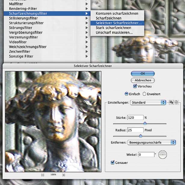 Mit der Version CS2 hat Photoshop einen neuen Scharfzeichnungsfilter erhalten, der den Namen „Selektiver Scharfzeichner“ trägt. Er baut auf anderen mathematischen Grundlagen auf und behandelt ein Bild so, als sei es zuvor mit einem von verschiedenen Weichzeichnungsfiltern (Gaußscher oder Bewegungsunschärfe) behandelt worden, deren Effekte er nun rückgängig zu machen versucht. In der Option „Einfach“ stehen die Parameter „Stärke“ und „Radius“ zur Verfügung sowie der angenommene Filter – hier „Bewegungsunschärfe“ –, dessen Wirkung vorausgesetzt wird. Mit der Option „Erweitert“ kommen Abmilderungsmöglichkeiten hinzu, ähnlich wie sie sich durch „Verblassen“ realisieren lassen. Erfolgreiche Parameter-Kombinationen lassen sich speichern und später erneut verwenden.