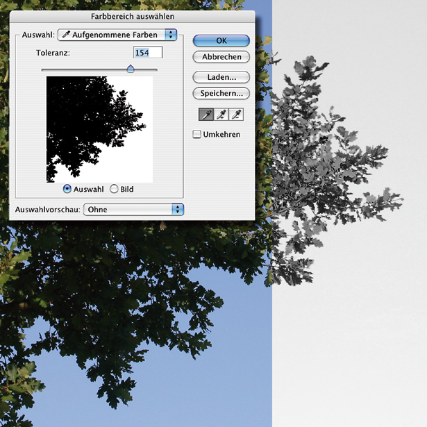 Sehr viel aufwendiger wird es, wenn Sie sich vorgenommen haben sollten, einen mitten im Wald stehenden Baum zu isolieren. Hier habe ich die Äste von der vorhergehenden Seite nach Auswahl und Kopie u?ber das Foto eines Waldweges gesetzt und dieses aufgehellt und leicht weichgezeichnet. Ohne diese Behandlung wären die Äste und Blätter kaum vom Hintergrund unterscheidbar gewesen. Wollen Sie einen solchen Baum freistellen, helfen alle Tricks, Spezialwerkzeuge und Plug-ins nichts – legen Sie eine Ebenenmaske an oder wechseln sie in den Maskierungsmodus und stellen Sie mit einem du?nnen Pinsel manuell sauber frei. Manchmal geht es nicht anders.