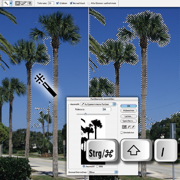 Bei diesem Bild bietet es sich an, die einheitliche Farbe des Hintergrunds zu nutzen. Dafür verwenden Sie den Zauberstab (links) oder den Befehl „Farbbereich auswählen“ (rechts). Setzen Sie den Zauberstab mit der Option „Benachbart“ ein, werden nur an die angeklickte Stelle angrenzende Pixel ähnlicher Färbung ausgewählt; die Farbähnlichkeit steuern Sie durch den „Toleranz“-Wert; diese Optionen sind oben in der Leiste einstellbar. Ohne aktiviertes „Benachbart“ sucht das Werkzeug solche Pixel im ganzen Bild. Ähnlich geht „Farbbereich auswählen“ vor, allerdings führt der Befehl nicht zu einer Entweder-oder-Auswahl, sondern Pixel werden je nach ihrer Farbähnlichkeit mehr oder weniger stark selektiert. Auch hier können Sie später Bereiche hinzufügen oder abziehen. Zum Schluss kehren Sie für die Selektion der Palmen die Auswahl um.