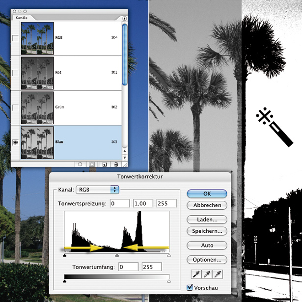 Oft hilft es beim Auswählen, wenn Sie sich in der Kanälepalette zunächst die unterschiedlichen Farbkanäle eines Bildes genauer daraufhin anschauen, welcher für das vorgesehene Objekt die stärksten Kontraste aufweist. Wenn die kleine Thumbnail-Darstellung dafür nicht ausreicht, betrachten Sie den Kanal selbst. In diesem Fall finden Sie die ausgeprägtesten Kontraste für die Palme im Blau-Kanal. Unter Umständen lässt sich die weitere Arbeit erleichtern, indem Sie ein Duplikat des Kanals per Tonwertkorrektur akzentuieren. Dazu verhilft ein Zusammenschieben der Schwarz- und Weißregler unter Sichtkontrolle (rechts).