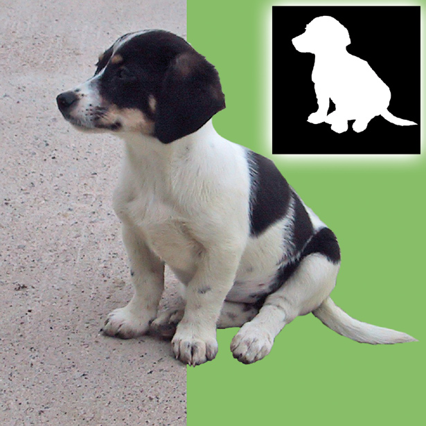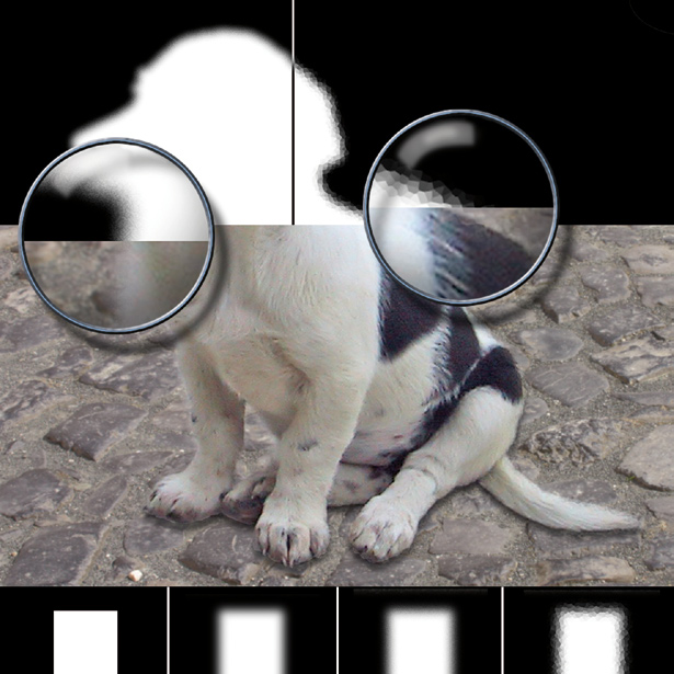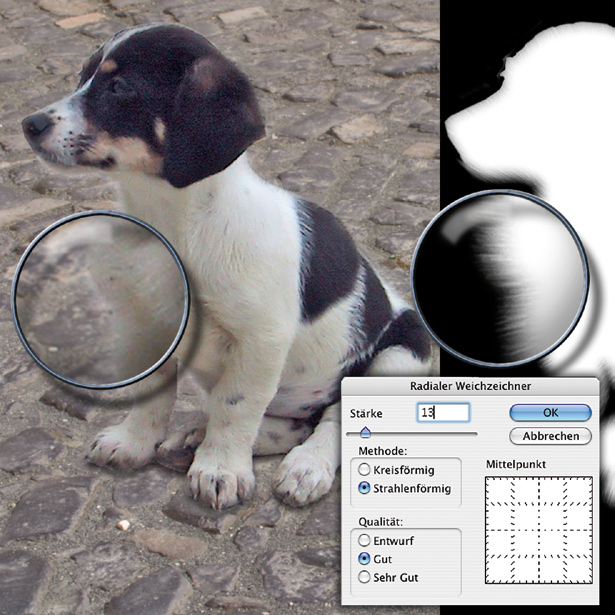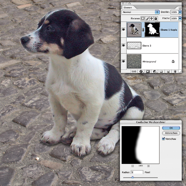 Die in solchen Fällen einfachste Vorgehensweise – im angelsächsischen Bereich wu?rde man das als „quick and dirty“ bezeichnen – besteht darin, die Ebenenmaske mit dem Gaußschen Weichzeichner zu soften. Da Sie das Bild dabei im Auge behalten können, bedarf es keines festgelegten Radius-Wertes, sondern Sie können nach Sichtkontrolle vorgehen. (Das ist auch ein Vorzug gegenu?ber einer weichen Auswahlkante, bei der sie erst nachträglich erkennen, wie das freigestellte Objekt vor einem neuen Hintergrund wirkt) In Bereichen, in denen eine schärfere Kante erwu?nscht ist, malen Sie diese in der Ebenenmaske u?ber die weichgezeichnete Randzone. Die mittlere Ebene in der Ebenenpalette enthält u?brigens den diffusen Schatten des Hundes auf den ausgetauschten Hintergrund.