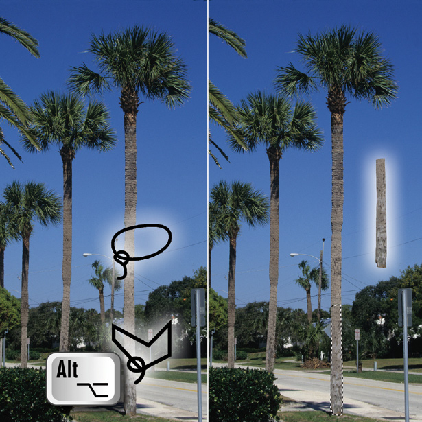 Sie können einer Lasso-Auswahl zwar Bereiche hinzufügen oder sie abziehen, aber nur durch erneutes manuelles Umfahren des gewünschten Bereichs. Anders ist das bei Pfaden, die Sie mit dem Zeichenstift-Werkzeug erzeugen (rechts vor aufgehelltem Hintergrund besser erkennbar). Ein Pfad kann aus geraden Segmenten und Kurven bestehen. Der Verlauf eines Pfades wird durch die Strecke zwischen zwei per Klick entstandenen Ankerpunkten definiert. Die Position dieser Punkte können Sie nachträglich ebenso verändern wie den Kurvenverlauf. Gerade und gleichmäßig geschwungene Konturen wie der Palmenstamm lassen sich mit diesem Werkzeug besser als mit dem Lasso festlegen. Eine Vergrößerung der Blätter zeigt allerdings so viele zu setzende Ankerpunkte, dass ein Pfad dort offensichtlich nicht effektiv ist.