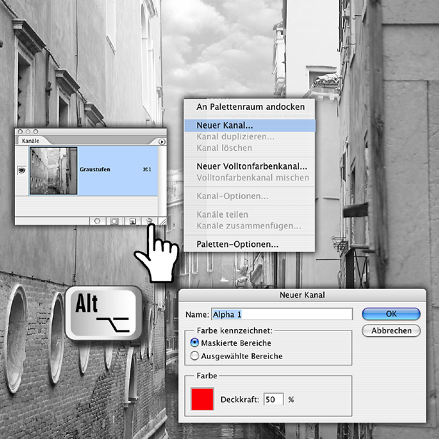 Bei den normalerweise verwendeten RGB- oder CMYK-Bildern können Sie keine weiteren Farbkanäle anlegen; sie bestehen aus den beschriebenen drei oder vier Kanälen dieser Art, mehr von ihnen hätten keine sinnvolle Funktion. Dagegen können Sie eine große Anzahl zusätzlicher Hilfskanäle erstellen, deren Einsatzmöglichkeiten wir uns auf den folgenden Seiten genauer anschauen. Diese Kanäle heißen „Alphakanäle“. Eine Bilddatei kann bis zu 56 Kanäle enthalten. Um einen neuen Alphakanal zu erzeugen, klicken Sie am Fuß der Kanäle-Palette auf das Symbol fu?r „Neuen Kanal erstellen“. Halten Sie dabei zusätzlich die Alt-Taste gedru?ckt oder gehen Sie u?ber das Menu? der Palette (oben rechts), können Sie in dem sich öffnenden Fenster einen eigenen Namen fu?r den Kanal und weitere Optionen festlegen.