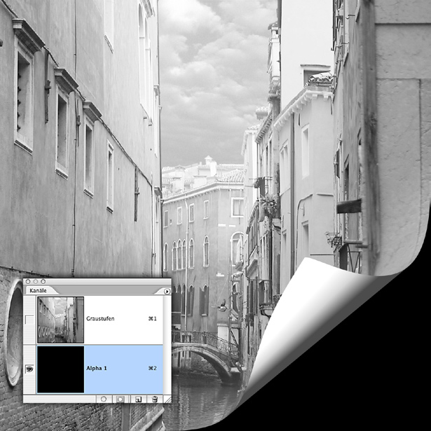 Sobald Sie den neuen (Alpha-)Kanal angelegt haben, wird das sichtbare Bild am Monitor schwarz (rechts). Das fu?hrt bei Einsteigern oft zu der Befu?rchtung, sie hätten ihr Bild nun versehentlich gelöscht. Betrachten Sie die Kanäle-Palette: in ihrer oberen Zeile ist das urspru?ngliche Bild nach wie vor unverändert zu sehen, das heißt es existiert noch, es ist im Augenblick lediglich ausgeblendet. Was Sie stattdessen sehen, ist der bei seiner Erstellung automatisch schwarz gefu?llte Kanal mit dem Namen „Alpha 1“. Die Ansicht oben entspricht nicht dem, was Sie am Bildschirm sehen, sondern zeigt nur, dass „unter“ dem Bild-Kanal mit den Graustufeninformationen des Fotos der neue, schwarze Kanal angelegt wurde. Die sichtbare und jeweils aktive Kanalzeile ist in der Palette farbig unterlegt und links mit einem Augensymbol versehen.