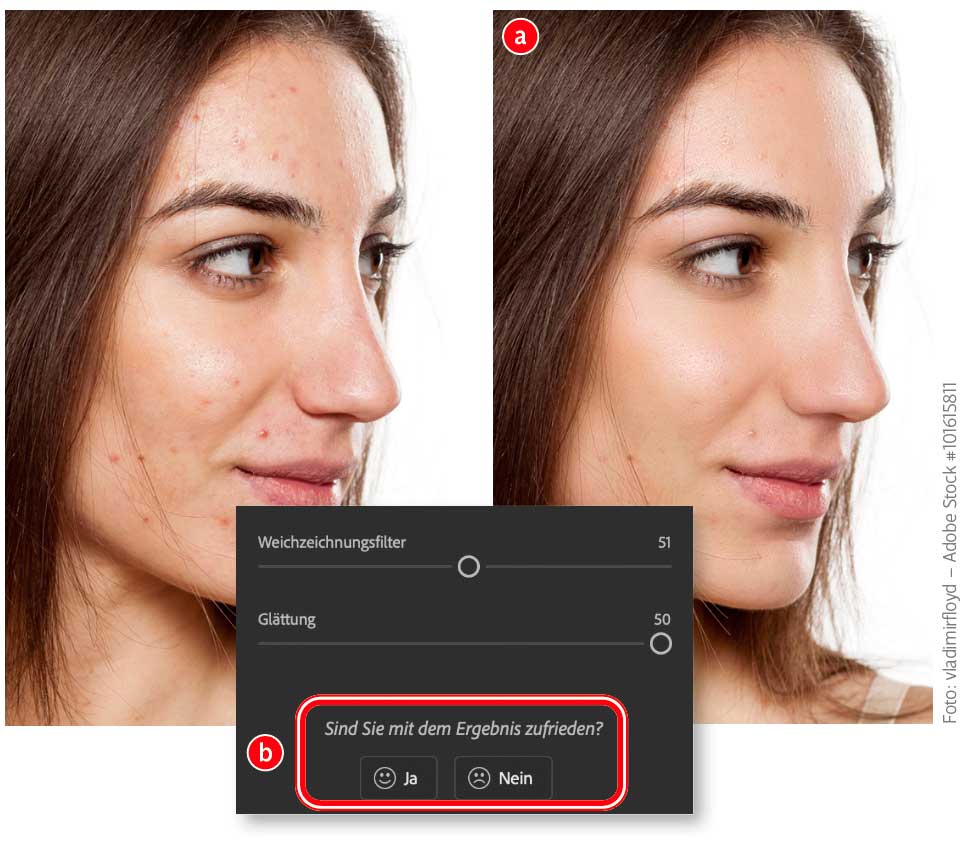Photoshops Neural-Filter »Hautglättung« zeichnet Haut nicht einfach weich, sondern reduziert auch Pickel und andere Hautstörungen. Das Ergebnis (a) kann sich sehen lassen und die verbliebenen Störungen sind mit »Reparaturpinsel« und Co. schnell retuschiert. Erwarten Sie jedoch keine Highend-Beauty-Hautretusche. Für schnelle, gar nicht mal schlechte Ergebnisse ist dieser Filter aber gut geeignet.