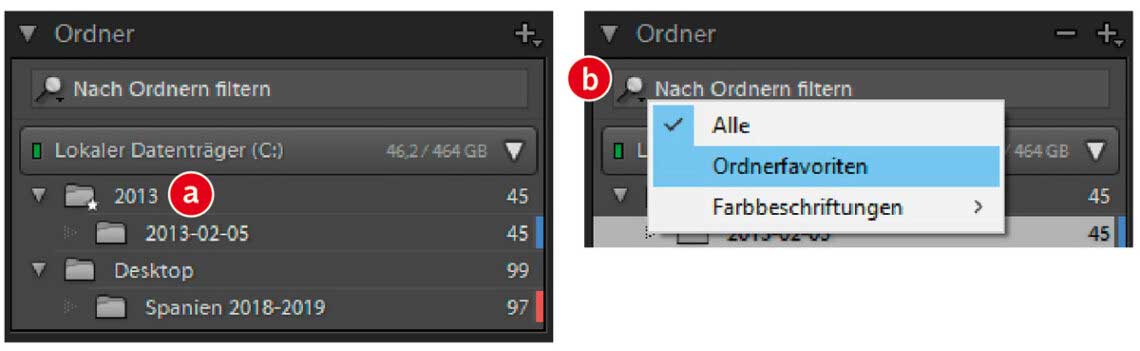 Besonders oft verwendete Ordner können Sie in Lightroom Classic als Favoriten markieren. Innerhalb der Ordnerstruktur klicken Sie mit der rechten Maustaste auf den zu markierenden Ordner (a). Im Kontextmenü wählen Sie die Option »Als Favorit markieren«. In der Übersicht wird nun ein kleines Sternsymbol eingeblendet. Bei umfangreichen Katalogen sind Sie nun in der Lage, eine zusätzliche Filterung vorzunehmen. Hierzu klicken Sie in der Suchmaske auf das Lupensymbol (b). Im Kontextmenü wählen Sie die Option »Ordnerfavoriten«, damit nur die markierten Ordner aufgelistet werden. Zudem haben Sie an dieser Stelle die Möglichkeit, nach Farbmarkierungen zu filtern.