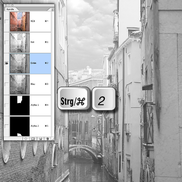 Alle wichtigen Tastenkombinationen in Zusammenhang mit Kanälen wurden ebenfalls im Zusammenhang mit der Demonstration der entsprechenden Funktionen vorgestellt. Erwähnt werden soll noch der schnelle Zugriff auf die drei oder vier Farbkanäle mit dem Kürzel Strg-/Befehlstaste-1 bis 4 sowie der ersten Alphakanäle mit Strg-/Befehlstaste 4 (bei RGB und Lab) beziehungsweise 5 (bei CMYK) oder auch 2 (bei Graustufenbildern) bis 9, entsprechend dem am rechten Rand der Kanalzeilen eingeblendeten Verweis.