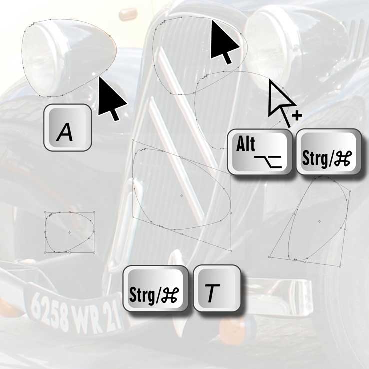 Mit der A-Taste rufen Sie das Pfadauswahl-Werkzeug auf (schwarzer Pfeil); klicken Sie damit einen Pfad an, wird er insgesamt aktiviert und kann zum Beispiel verschoben oder gelöscht werden (oben). Halten Sie bei aktivem Pfadauswahl-Werkzeug die Tasten Alt und Strg (Alt und Befehl beim Mac) gedrückt, wird die Pfeilspitze weiß und daneben erscheint ein Plus-Zeichen; auf diese Weise lässt sich der Pfad duplizieren. Drücken Sie Strg-/Befehls- und T-Taste – beziehungsweise gehen Sie im Bearbeiten“-Menü zu „Pfad transformieren“ – erscheint ein Transformationsrahmen, mit dessen Hilfe Sie den Pfad skalieren, neigen oder verzerren können (unten) – mit Photoshop CS2 sogar verkrümmen.