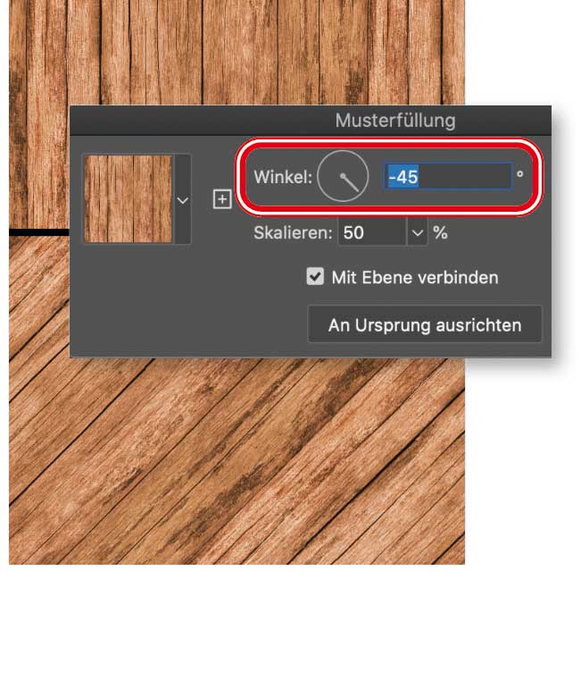 Seit dem Juni-Update 2020 lassen sich Muster in Photoshop ohne destruktive Workarounds drehen. Die Musterdrehung ist durch Eingabe eines Winkels möglich. Die Drehen-Schaltfläche und das zugehörige numerische Eingabefeld finden Sie in der Füllebene vom Typ »Muster«, bei den Ebenenstilen »Muster« und »Kontur« sowie bei den Form-Werkzeugen in der Optionsleiste unter »Als Muster füllen« und in den Kontureigenschaften.