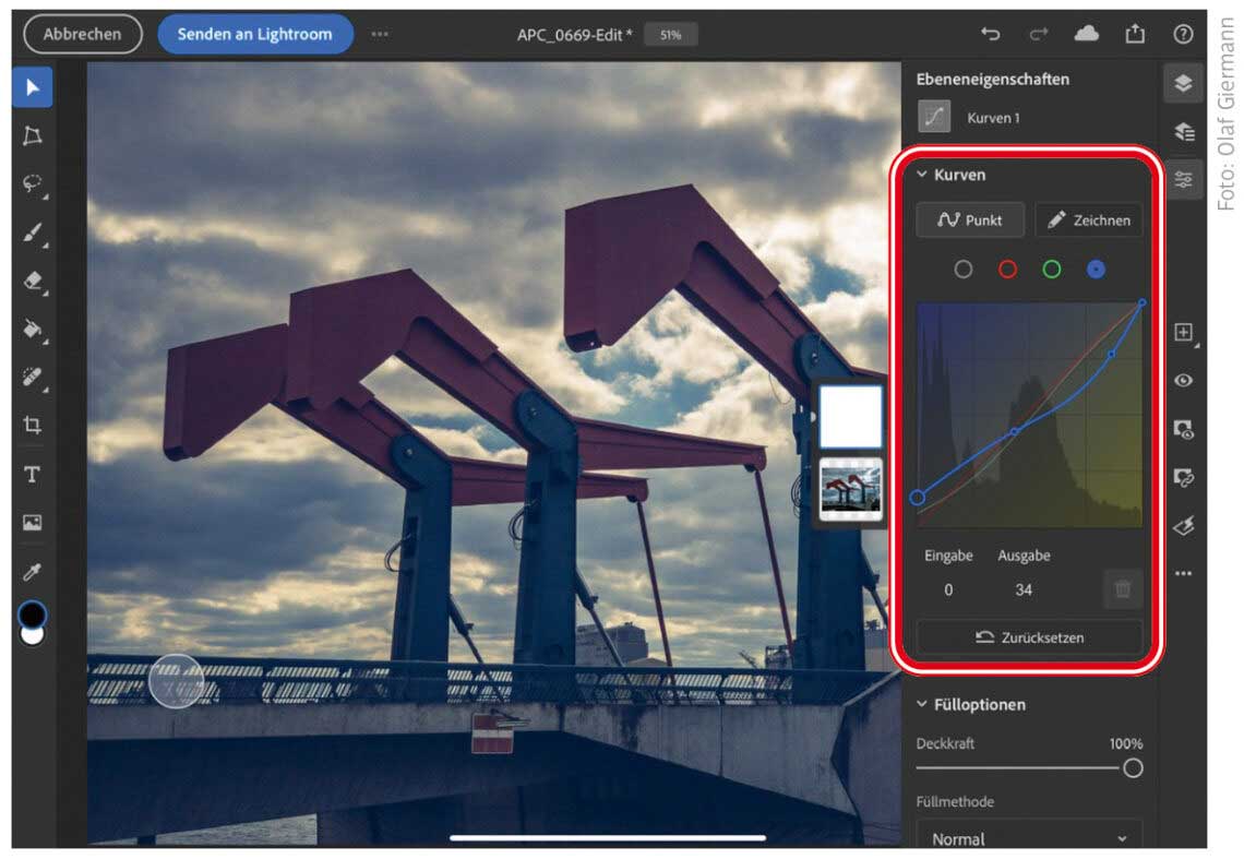 Mit dem Juni-Update 2020 hat Photoshop auf dem iPad erstmals eine Einstellungsebene vom Typ »Gradationskurve« spendiert bekommen. Dadurch erweitern sich die Farbkorrektur- und Farbstilisierungsmöglichkeiten auf dem iPad immens, denn die bereits vorhandene »Farbbalance« erlaubt beispielsweise nur eine Korrektur der Mitteltöne. Das Interface der Kurven ist nicht nur sehr hübsch, sondern auch sehr praktisch geworden: Zwischen den einzelnen Kanälen wechseln Sie mit nur einem Tap auf die entsprechenden Symbole. In der Desktop-Version müssen Sie dafür das Dropdown-Menü oder Tastaturkürzel bemühen. Farbüberlagerungen in den einzelnen Kanälen zeigen an, welche Farbe Sie erhalten, wenn Sie die Kurve in die jeweilige Richtung verschieben. Das alles wäre auch im echten Photoshop wünschenswert. Leider wurden noch nicht alle Funktionen der Desktop-Version implementiert. So können beispielsweise Ein- und Ausgabewert gesetzter Punkte nicht numerisch eingegeben werden und die Pipetten für Schwarz-, Grau- und Weißpunkt fehlen – genauso wie alle Auto-Korrekturoptionen. Auch das »Zielgerichtet-anpassen-Werkzeug« sucht man vergeblich.