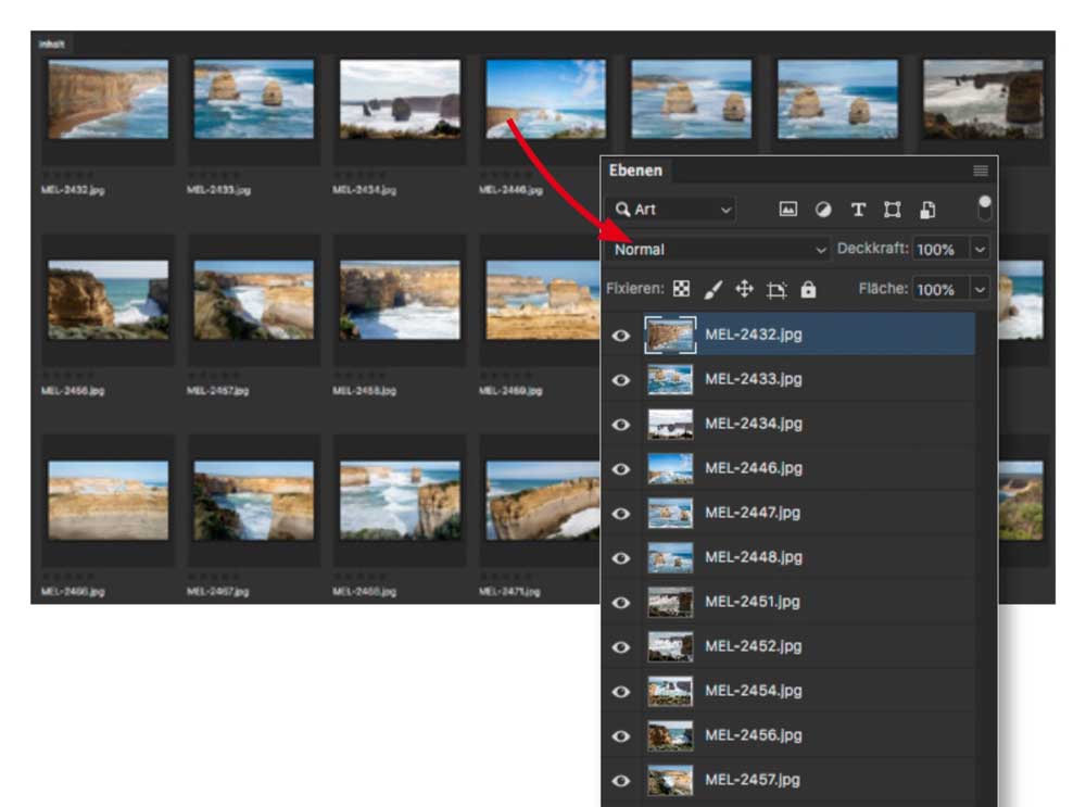 Hinweis: Falls Sie bereits in Photoshop geöffnete Bilder als Ebenen übereinanderlegen möchten, wählen Sie »Datei > Skripten > Dateien in Stapel laden«
