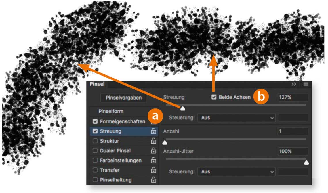 Beim Malen kann Ihnen eine zufällige Verteilung der einzelnen Pinselspitzen-Abdrücke viel Arbeit ersparen. Denn in einem einzigen Pinselstrich erzeugen Sie variierende Pinselabdrücke, für die Sie sonst viele Einzelklicks benötigen würden. Nutzen Sie dafür die Parameter in der »Pinsel«-Palette unter »Streuung«. Der dort zu findende, gleichbenannte Regler »Streuung« verteilt die Pinselabdrücke zufällig rechtwinklig zum Pinselstrich (a). »Beide Achsen« streut die Pinselabdrücke zusätzlich auch in Malrichtung und sorgt für mehr Variation (b). Die Parameter »Anzahl« und »Anzahl-Jitter«, mit denen Sie die Anzahl der pro Pinselstrich angewendeten Pinselspitzenabdrücke steuern können, bieten weitere Variationsmöglichkeiten. Hier gibt es weder eine Pauschalempfehlung noch „korrekte“ Werte. Probieren Sie einfach verschiedene Kombinationen aus!