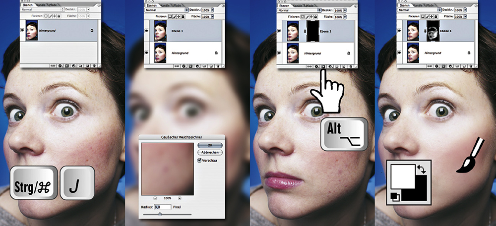 Mit Ebenenmasken muss sich jeder Retuscheur bestens auskennen. Bevor wir später die praktische Anwendung sehen, soll hier nur kurz die prinzipielle Funktionalität erläutert werden: Ebenenmasken blenden den Inhalt einer Ebene ein oder aus. Klicken Sie in der Ebenen-Palette auf das Ebenenmasken-Symbol, so erscheint neben der Ebenen-Miniatur ein weißes Feld. Wenn Sie es anklicken und dort mit schwarzer Farbe malen, werden die geschwärzten Bereiche ausgeblendet.