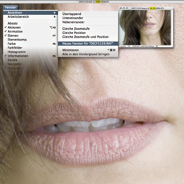 Wer in einer starken Vergrößerung arbeitet, sollte unbedingt mit dem Befehl „Neues Fenster für (Dateiname)“, den Sie im Menu? „Fenster“ unter „Anordnen“ finden, eine zweite Ansicht aufrufen, um den Bildeindruck, der sich aus den Retuschen ergibt, besser beurteilen zu können. Um für solche Kontrollroutinen genug Platz auf dem Desktop zu haben, arbeiten Sie idealerweise mit zwei 1280 Pixel breit auflösenden Monitoren (SXGA) oder einem sehr großen Monitor mit einer Auflösung von 1920 Pixel Breite (WUXGA) aufwärts.