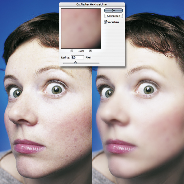 Lieblingswerkzeug der Porträt-Retuscheure ist der „Gaußsche Weichzeichner“ oder der ab CS verfügbare Filter „Verwackeln“ (ab CS2: „Tiefenschärfe abmildern“). Hiermit werden Hautpartien auf duplizierten Ebenen gesoftet und weich mit dem Untergrund verrechnet. Im Ergebnis sieht es so aus, als hätte man das Model mit einer Weichzeichner-Optik aufgenommen und/oder mit weichem, indirektem Licht ausgeleuchtet. Das geht schnell und wirkt manchmal auf den ersten Blick eindrucksvoll, doch sollte man den Effekt nicht – wie oben im Bild – übertreiben.