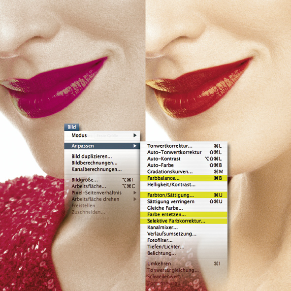 Zur Korrektur der Farben von Haut, Lippen, Haaren und Augen finden Sie eine Vielzahl von Dialogen im Menü „Bild“ unter „Anpassen“ (in älteren Photoshop-Versionen hieß der Untereintrag „Einstellen“). Für welche Werkzeuge man sich entscheidet, ist zum einen eine Frage der persönlichen Vorlieben, zum anderen hängt sie von der jeweiligen Aufgabe ab. Zur Abstimmung von Farben eignet sich nach meiner Meinung die „Selektive Farbkorrektur“ am besten, zum Umfärben der Dialog „Farbton/Sättigung“.