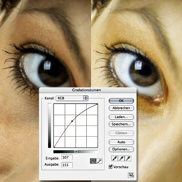 Auch die Bildhelligkeit spielt für die Wahrnehmung eines Porträts eine sehr große Rolle. Zu einen versucht der Fotograf ein Bild in der Regel so abzustimmen, dass möglichst viel Zeichnung erhalten bleibt, zum anderen lässt sich aber durch das Aufhellen der Mitten mancher Makel ohne große Retuschen abmildern. Als Werkzeuge stehen die Gradationskurven und die Tonwertkorrektur zur Wahl. Vom Dialog „Helligkeit/Kontrast“ sollte man als qualitätsbewusster Bildbearbeiter die Finger lassen, da dieses Werkzeug dem Bild mehr Schaden zufügt als technisch nötig ist.