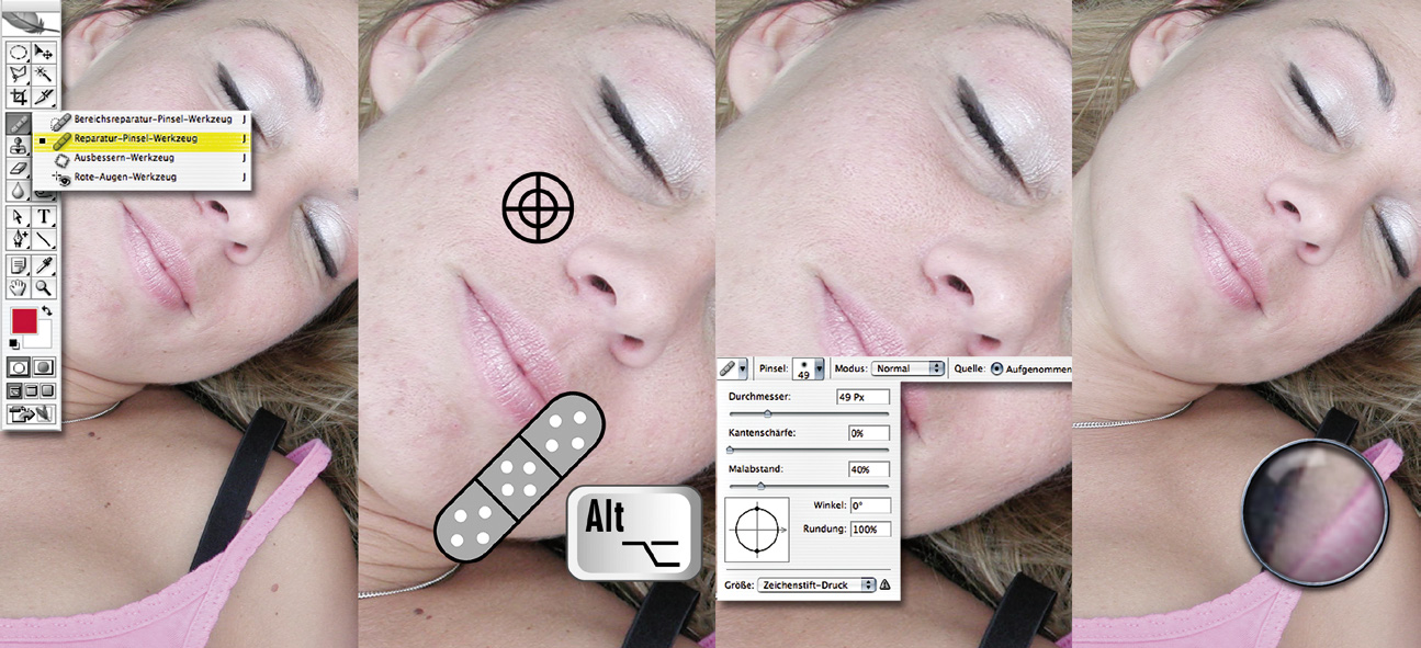 Der Reparaturpinsel (ab Photoshop 7) arbeitet im Prinzip wie der Stempel, im Unterschied dazu trägt er aber nicht einfach nur den Bildinhalt des Referenzpunkts auf, sondern berücksichtigt beim Auftrag die Struktur der Umgebung des Zielpunkts. Für „Haut-Transplantationen“ ideal, nur lässt sich das Werkzeug beim Überdecken größerer Stellen oftmals nicht hinreichend steuern. Es stehen zwar Verrechnungsmodi für den Auftrag zu Wahl, die Art der Rekonstruktionsberechnung lässt sich jedoch nicht manipulieren.