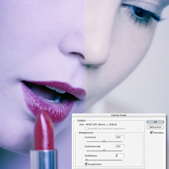 Obwohl der Dialog „Gleiche Farbe“ eigentlich dazu gedacht ist, zwei farblich unterschiedliche Bilder anzugleichen, können Sie auch nur ein einzelnes Bild öffnen und die Checkbox „Ausgleichen“ aktivieren. Sollte das Ergebnis Ihren Vorstellungen nicht ganz entsprechen, lässt es sich mit den drei Schiebereglern daru?ber hinsichtlich der Luminanz, der Farbintensität und des Verblassungsgrades weiter abstimmen.