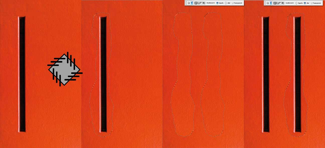 Großflächige Bereiche lassen sich seit Photoshop CS mit dem „Ausbessern-Werkzeug“ retuschieren. Dabei handelt es sich um eine Kombination aus dem Lasso und dem Reparatur-Pinsel. Es gibt zwei Arten dieses Werkzeug einzusetzen. „Quelle“ und „Ziel“. Bei der Ausbessern-Variante „Quelle“ umfahren Sie den zu entfernenden Bildbereich mit der Auswahlfunktion, die der eines einfachen Lassos entspricht. Dann ziehen Sie die erzeugte Auswahl auf den Bereich, der diese Stelle überlagern soll und lassen die Maustaste zur Anwendung los. Bei der „Ziel“-Variante wählen Sie den Referenzbereich aus, der an eine andere Stelle kopiert werden soll, und ziehen anschließend die Auswahl auf das Ziel. Bei beiden Varianten werden die Anschlüsse weich mit der neuen Umgebung verrechnet und auch die Helligkeitsstruktur wird berücksichtigt. Es bedarf also einiger Erfahrung, bis man damit brauchbare Ergebnisse erzielt.