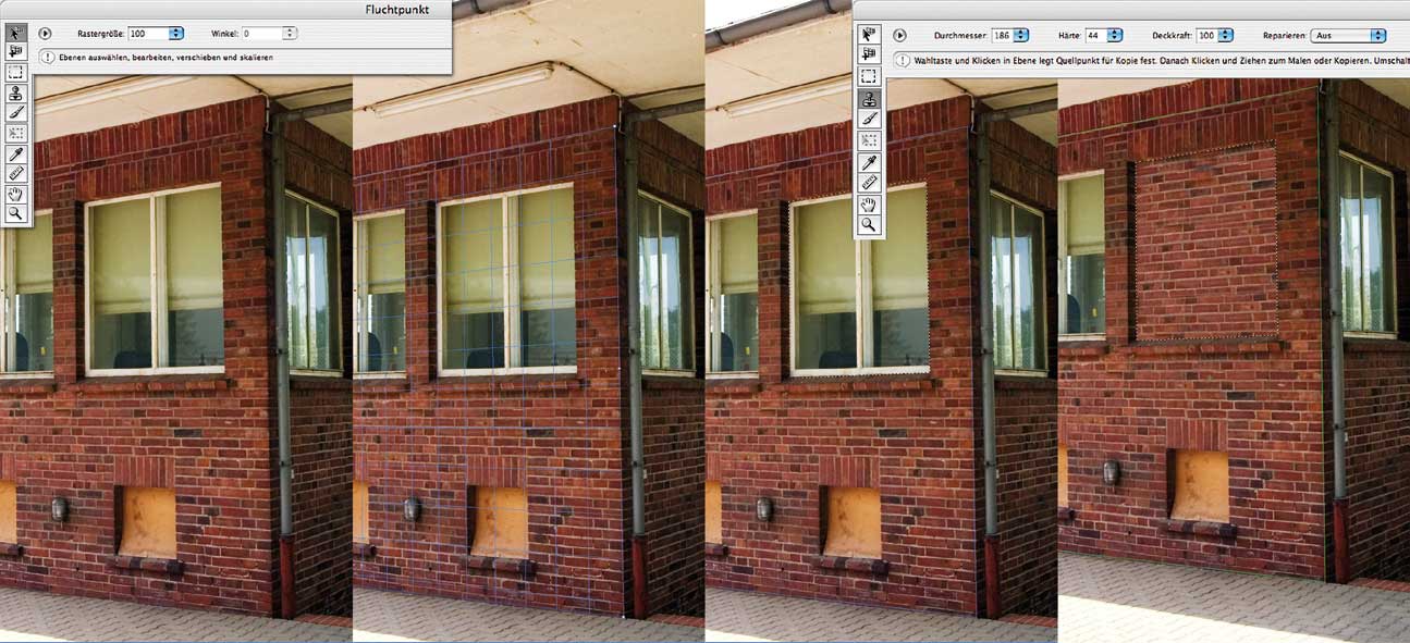 Tipp: Hat man sich erst mal an die Verschiebemöglichkeiten auf der Fläche gewöhnt, ist es Zeit, die nächste Stufe des Fluchtpunkt-Retuschierens zu entdecken: Das „Um-die-Ecke-Verschieben“. Sofern ein Motiv es hergibt, können Sie Ihr „Drahtgitter“ auch um die Ecken ziehen und ausgewählte Bereiche dann auch um die Ecke verschieben. Allerdings ist das außer bei schattenfreien Bildern wegen der Beleuchtungsdiskrepanzen nicht unbedingt zu empfehlen.