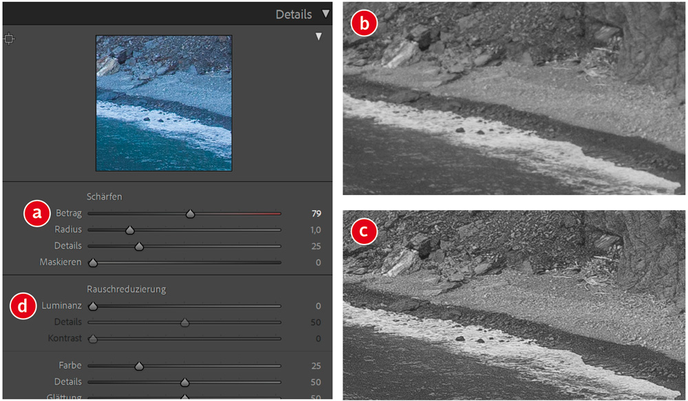 Die Regler für Schärfe und Rauschreduzierung erfordern ein präzises Einstellen der Werte, um ein optimales Entwicklungsergebnis zu erzielen. Öffnen Sie das »Entwickeln«-Modul und halten Sie die »Alt«-Taste gedrückt. Wenn Sie nun den »Schärfen«-Regler (a) bewegen, wird das aktive Foto (b) in Schwarz-weiß angezeigt, um das Ergebnis der Schärfung (c) besser beurteilen zu können. Wählen Sie hierzu am besten eine Zoomstufe > 100 Prozent. Auch die Regler für »Radius«, »Details« und »Maskieren« lassen sich über diesen Weg besser justieren. Das gleiche Vorgehen können Sie auch bei den Reglern für die »Rauschreduzierung« (d) nutzen.