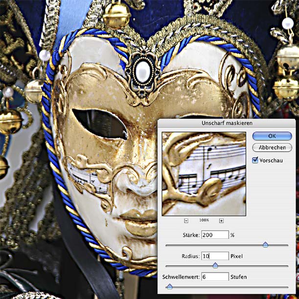 Dieses Bild unserer venezianischen Maske ist völlig u?berschärft. Eigentlich sollen nur gewisse Details wie etwa die feinen Noten auf der Wange klarer dargestellt werden. Aber wie schaffen Sie es, den Filter „Unscharf maskieren“ zu zwingen, nur in solchen Bereichen tätig zu werden? Eine Luminanzmaske hilft hier nicht weiter – wohl aber die soeben vorbereitete Konturenmaske. Auch wenn die Schwellenwert-Einstellung des Filters bereits die Beru?cksichtigung von Kontrastgrenzen erlaubt (die Anzahl der Stufen beim unteren Regler bedeutet, dass Tonwerte entsprechender Nähe nicht geschärft werden), so reicht sie doch nicht aus. Aber im Alphakanal haben Sie ja jetzt eine Maske, in der die kräftigsten Kontrastspru?nge des Bildes als schwarze Konturen gesichert sind – nutzen Sie sie!