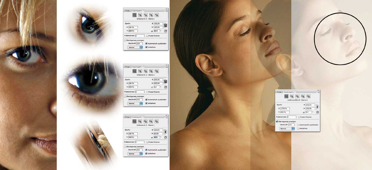 In Photoshop CS3 wurde das Stempel-Werkzeug um die Optionen der Palette „Stempel-Quelle“ erweitert. Damit kann man statt einem nun fünf Referenzpunkte definieren und diese bei Bedarf zusätzlich transformieren. Das ist sicher technisch ein großer Schritt nach vorne, doch wird es für die tägliche Anwendung eine eher geringe Rolle spielen. Interessanter dagegen ist die Möglichkeit, eine Voransicht der Quelle beim Stempelvorgang zu nutzen, mit der man einen deutlich besseren Überblick über seine Arbeit gewinnt. Sie müssen nur den Schalter „Zeige Überlagerung“ in der neuen Palette anschalten. Über einen Umweg funktioniert das auch mit Photoshop CS2: