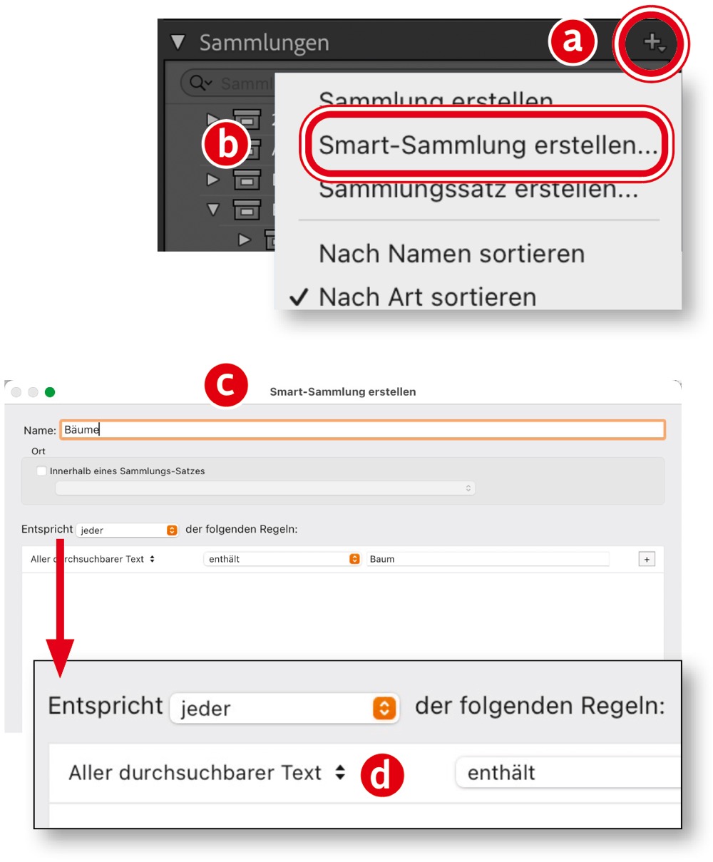 Suchen Sie immer wieder nach denselben Stichwörtern? Dann speichern Sie solche Suchabfragen einfach als Smart-Sammlungen! Klicken Sie im Panel »Sammlungen« auf das Plus-Symbol (a) und anschließend auf »Smart-Sammlung erstellen« (b). Im sich öffnenden Dialog (c) werden Sie leider vergeblich nach der Kategorie »Stichwörter« suchen. Nutzen Sie stattdessen die Option »Aller durchsuchbarer Text« (d) und geben Sie im Textfeld rechts von »enthält« das gewünschte Stichwort oder eine Kombination aus mehreren ein. Künftig genügt zur Anzeige der gesuchten Bilder ein Klick auf die Smart-Sammlung.