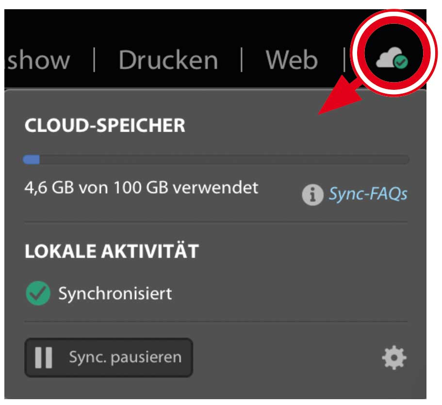 In Lightroom Classic wird seit dem juni-Update 2020 der Status der Cloud-Synchronisation wie in Lightroom über ein eigenes Icon in der rechten oberen Programmecke angezeigt. Klicken Sie auf das Icon, um detailliertere Informationen über Ihr Speicherkontingent zu erhalten oder um die Synchronisierung zu pausieren. Über das Zahnrad-Symbol unten rechts springen Sie direkt zu den Synchronisierungsvoreinstellungen von Lightroom Classic.