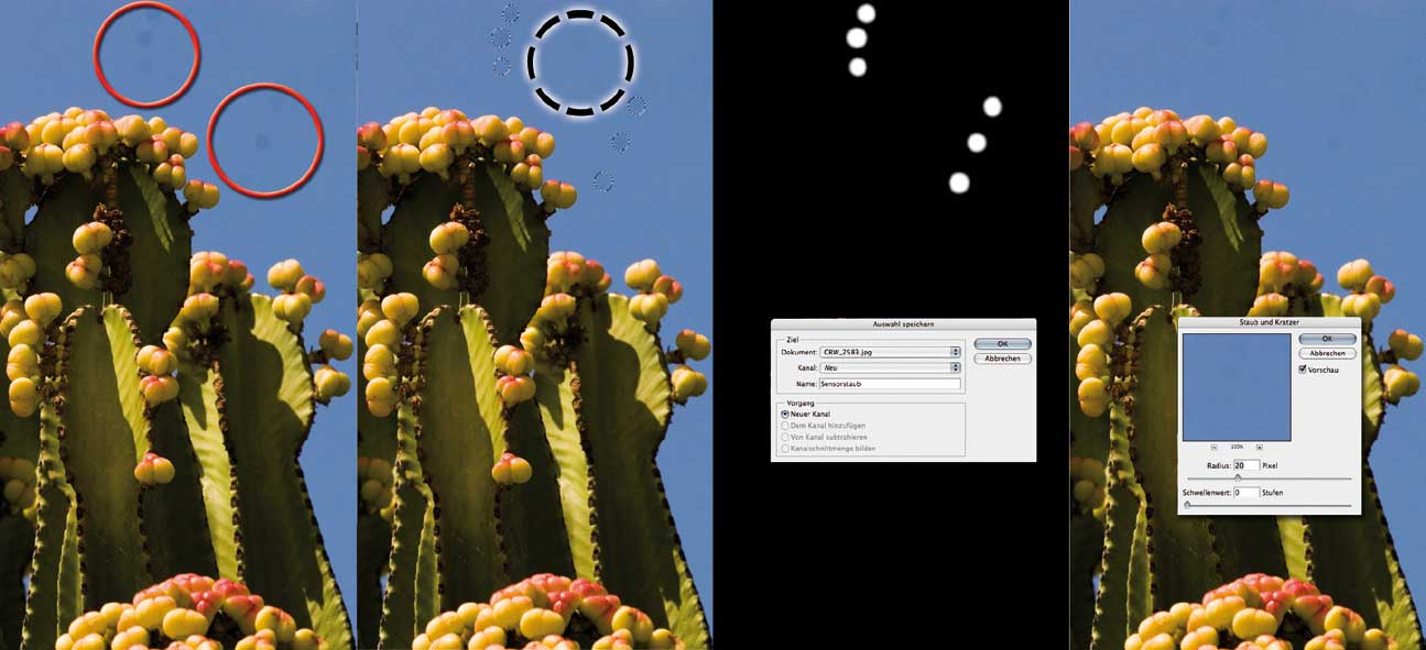 Wer Senorstaub von einem oder mehreren Bildern entfernen muss, dies aber nicht im Camera Raw-Modul von Photoshop tun kann oder will, muss sich anders behelfen. Wählen Sie zunächst in einem Referenzbild ein Staubkorn oder mehrere so präzise wie möglich aus und speichern Sie die Auswahlen in einem Alphakanal. Dann laden Sie den Alphakanal und wenden auf die Auswahl den Störungsfilter „Staub und Kratzer“ mit einer Stärke an, die das Staubkorn verschwinden lässt. Bei der Anwendung für mehrere Bilder zeichnen Sie eine Aktion auf. Achten Sie bei der Aufzeichnung darauf, den Alphakanal über die Zwischenablage einzusetzen, statt ihn erneut anzulegen, und löschen Sie ihn nach Abschluss der Bearbeitung wieder, um die Bildgröße nicht unnötig aufzublähen. Die Anwendung auf ganze Verzeichnisse mit gleich großen Bildern, die dasselbe Staubkornmuster aufweisen, nehmen Sie mit dem „Automatisieren“-Dialog „Stapelbearbeitung“ vor.