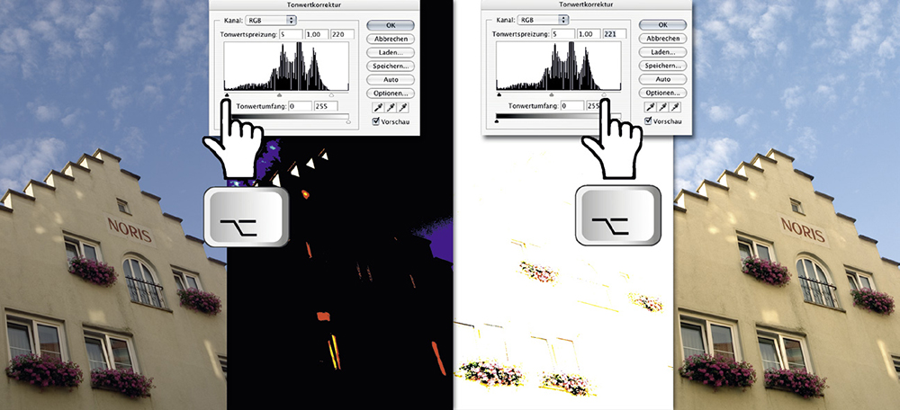 Wenn Sie sich mit dem Beschnitt der Tonwerte manuell vortasten, laufen Sie natürlich Gefahr, Zeichnungsverluste in Kauf zu nehmen. Um gefährdete Bildstellen während der Bearbeitung (und bei der Arbeit mit einer Einstellungsebene auch später noch) zu visualisieren, gibt es einen Trick: Wechseln Sie in den RGB-Komposit-Kanal, halten die Alt-Taste gedrückt und klicken auf den schwarzen oder den weißen Schieberegler unter der Histogrammdarstellung. Beim ersten sehen Sie in der grafischen Darstellung, in welchen Farbauszügen es zu Zeichnungsverlusten in den Tiefen kommt. Beim zweiten wird Ihnen dieselbe Information für die Lichter angezeigt. Berücksichtigt werden übrigens alle sechs Grundfarben Rot, Grün, Blau, Cyan, Magenta und Gelb.