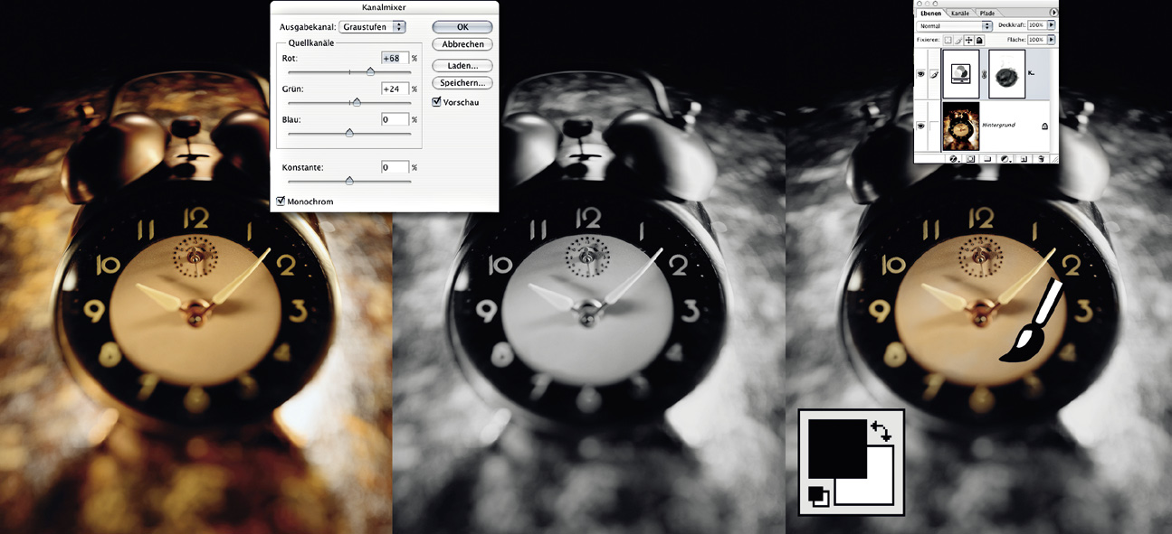 Entfärbungstechniken gibt es mehrere. Wir verwenden hier den „Kanalmixer“ als Einstellungsebene, wobei wir die Funktionsweise auf „Monochrom“ setzen. Einstellungsebenen sind automatisch mit einer Ebenenmaske kombiniert, die Sie in der Ebenen-Palette neben dem Einstellungsebenen-Symbol finden. Diese regelt durch ihre Fu?llfarbe die Anzeige der mit der Einstellungsebene verbundenen Änderungen. Konkret heißt das, wenn die Ebenenmaske weiß ist, sehen Sie die Änderungen, ist sie schwarz, werden die Änderungen ausgeblendet. Die Ebenenmaske können Sie mit dem Pinselwerkzeug bearbeiten, nachdem Sie sie per Klick in der Ebenen-Palette aktiviert haben. Um die Farbe des Vordergrundmotives wieder hervorzuholen, die durch die Kanalmixer- Ebenen ausgeblendet wird, malen Sie die entsprechenden Bildbereiche mit schwarzer Farbe auf der Ebenenmaske aus.