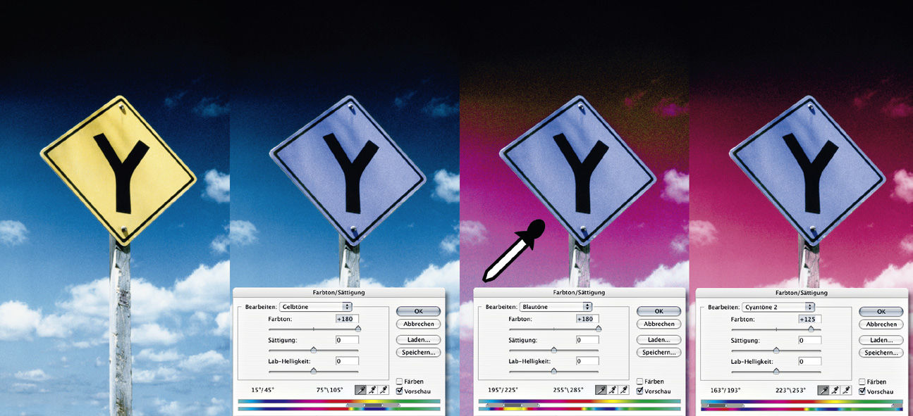 Nicht immer ist es erforderlich, das ganze Bild farblich zu verändern. Wenn Sie nur bestimmte Farben korrigieren möchten, finden Sie hier – ähnlich wie bei der „Selektiven Farbkorrektur“ – die Option vor, eine der sechs Grundfarben direkt anzusteuern. Diese Farbvorwahl ist aber nur der erste Schritt. Verschieben Sie anschließend den Farbtonregler ein Stück weit. Bei dem gelben Warnschild klappt das ganz prima. Wenn Sie das Prinzip jedoch auf den blauen Himmel anwenden wollen, wird nicht der ganze Umfang erfasst. Aktivieren Sie das „Pipette-Werkzeug“ und klicken anschließend auf die noch nicht erfassten Bereiche im Bild, die auch umgefärbt werden sollen.