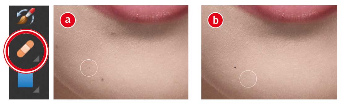 Der »Reparaturpinsel« ist ein hervorragendes Werkzeug, um bei der Beautyretusche Störungen zu entfernen und Bereiche auszubessern. Nachdem Sie den »Reparaturpinsel« in der Werkzeugpalette aktiviert haben, passen Sie die Größe der Pinselspitze der Störung an und wählen einen Referenz-Bereich (a) mit der gedrückten »Alt«-Taste aus, der auf die Störung (b) kopiert werden soll. Der Pinsel verrechnet die beiden Bildinformationen automatisch miteinander.