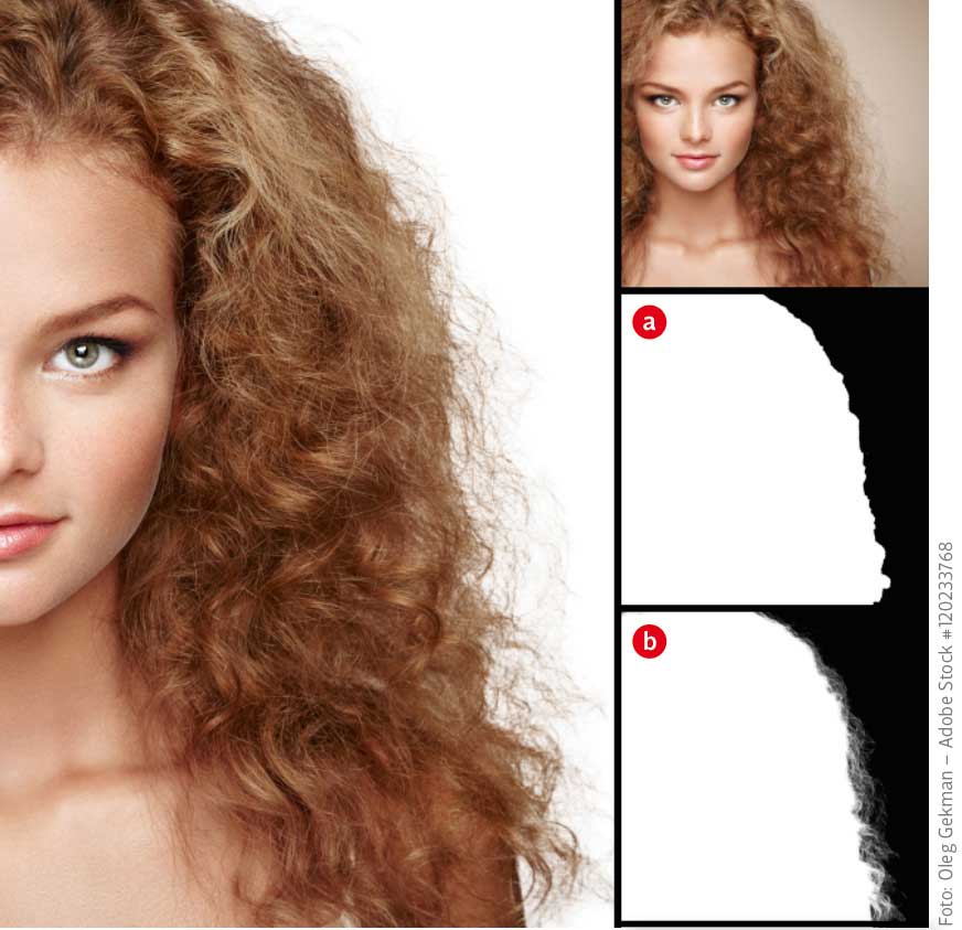 Die vollautomatische Motivauswahl arbeitet seit dem Juni-Update schneller und liefert bei Porträts im Bereich der Haare deutlich bessere Ergebnisse. Mit dem Befehl »Auswahl > Motiv« erkennt Photoshop das Hauptmotiv im Bild und wählt dieses aus. Neu ist, dass dabei nun eine Personenerkennung integriert ist, wodurch die Auswahl generell genauer ausfällt. Am deutlichsten verbessert wurde die Auswahl von Haaren. Während der ältere Algorithmus in jedem Fall noch ein Nacharbeiten in »Auswählen und maskieren« erforderte (a), lässt sich das Ergebnis des neuen, oft auch ohne Korrekturen, direkt übernehmen (b).